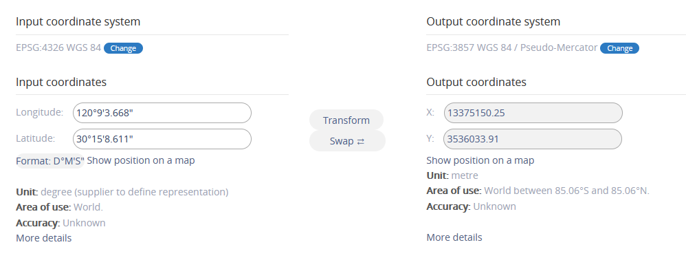 http://epsg.io/transform#s_srs=4326&t_srs=3857&x=120.1510190&y=30.2523920